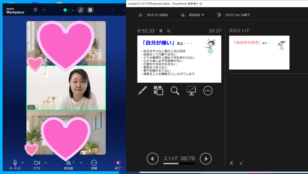 2026年4月8日 とくべつ授業オンライン カウンセラーのたまごと一緒にマインドハグ TWEET SHARE LINE 北海道在住 マインドハグ®認定サポーターのみらくです サポートしているチームの受講生が2名参加してくれました✨慣れてきた仲間だけでの安心に包まれた中で開催。大きな大根のクッション、プーさんのクッションを用意されていました💛照れながらもマインドハグをしっかりできて、よい笑顔となりました。